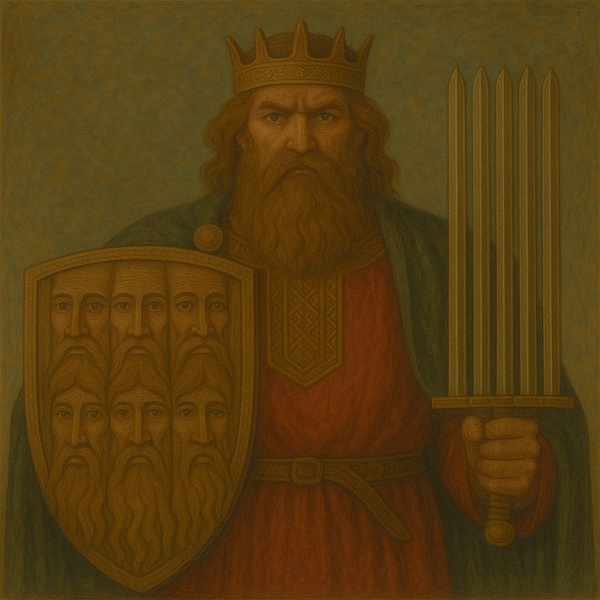 The main temple of Rugovit was in Charenza on Rügen island, where a massive oak idol depicted him with seven faces and seven swords at his belt, plus an eighth sword in his hand.